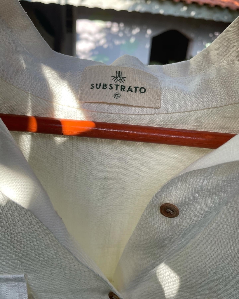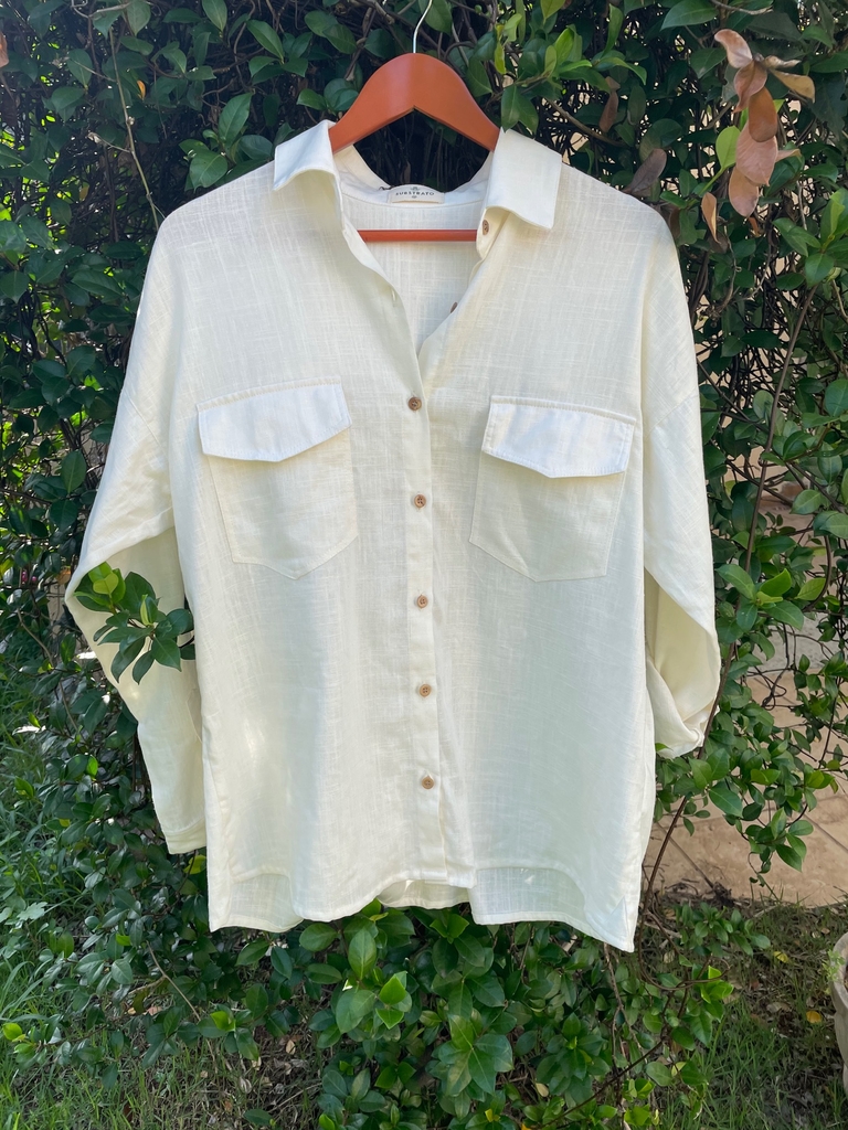 A Camisa Jerivá Off White é confeccionada em viscolinho, sendo 85% viscose e 15% linho.