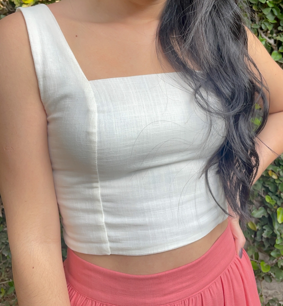 A modelagem é justa no corpo, com decote quadrado. As alças são grossas para poder usar com sutiã e a peça inteira é construída em tecido duplo para não marcar nada. A parte das costas contém lastex, afim de modelar ainda mais o corpo e dar maior mobilidade.