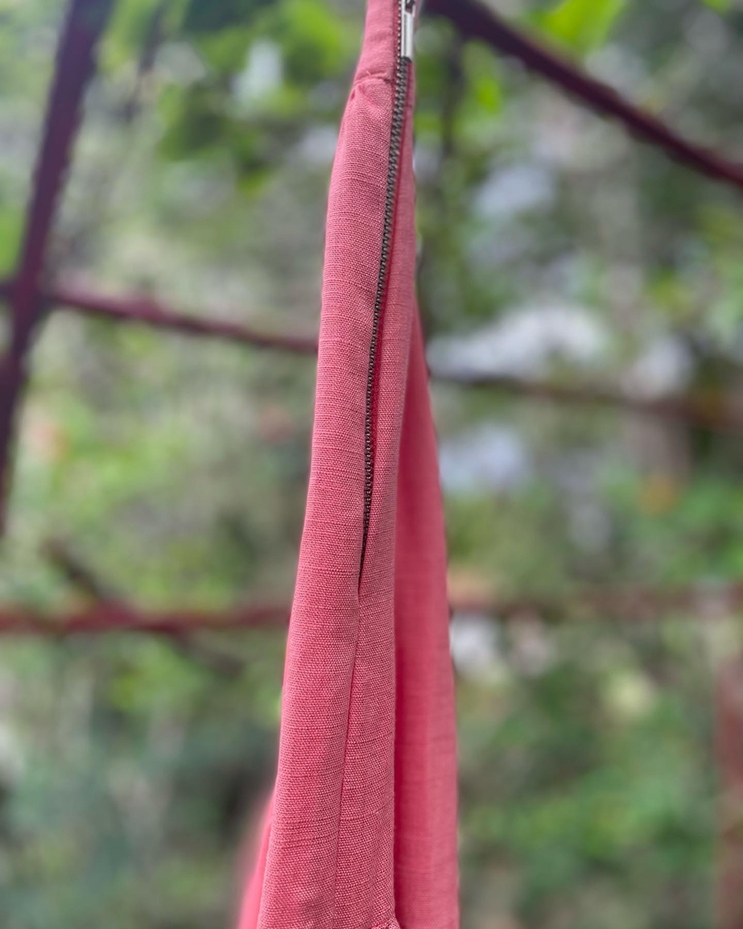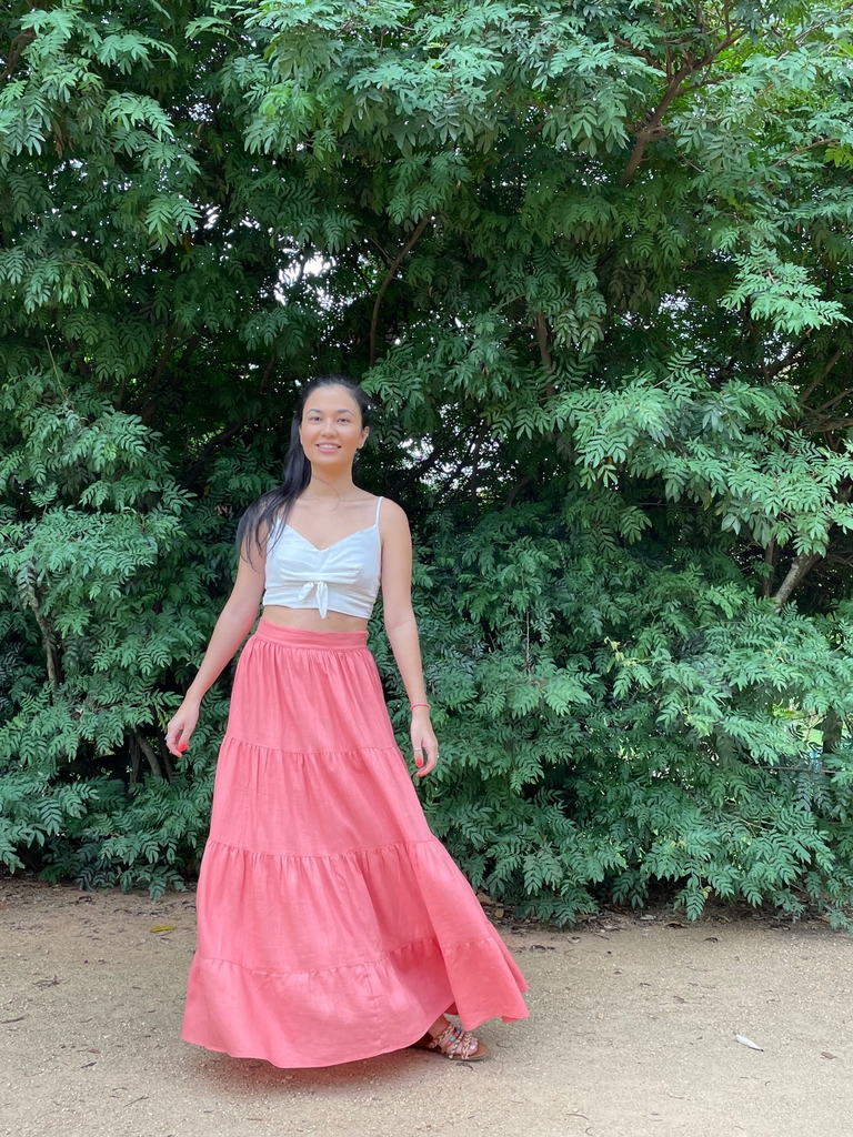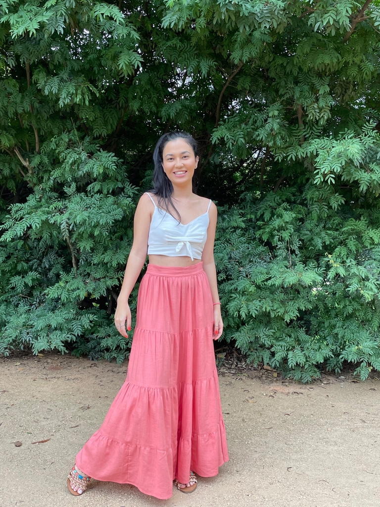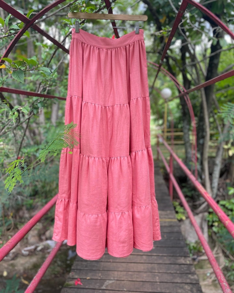 A Saia Longa Flamboyant Rosa é confeccionada em tecido plano de viscolinho, sendo 85% viscose e 15%linho.